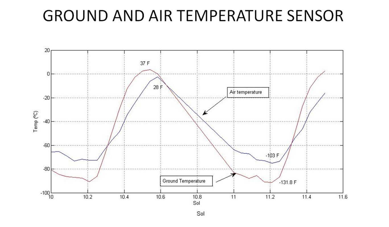 This graph shows the rise and fall of air and ground temperatures on Mars obtained by NASA's Curiosity rover. The data cover Aug. 16 to Aug. 17, 2012 and were taken by the Rover Environmental Monitoring Station. Ground temperatures vary from as high as 37 degrees Fahrenheit (3 degrees Celsius) to as low as minus 131.8 degrees Fahrenheit (minus 91 degrees Celsius), showing large temperature oscillations from day to night. Air temperatures vary from as high as 28 degrees Fahrenheit (minus 2 degrees Celsius) to as low as minus 103 degrees Fahrenheit (minus 75 degrees Celsius), indicating, as expected, variations in air temperatures are less extreme than ground temperature variations.
