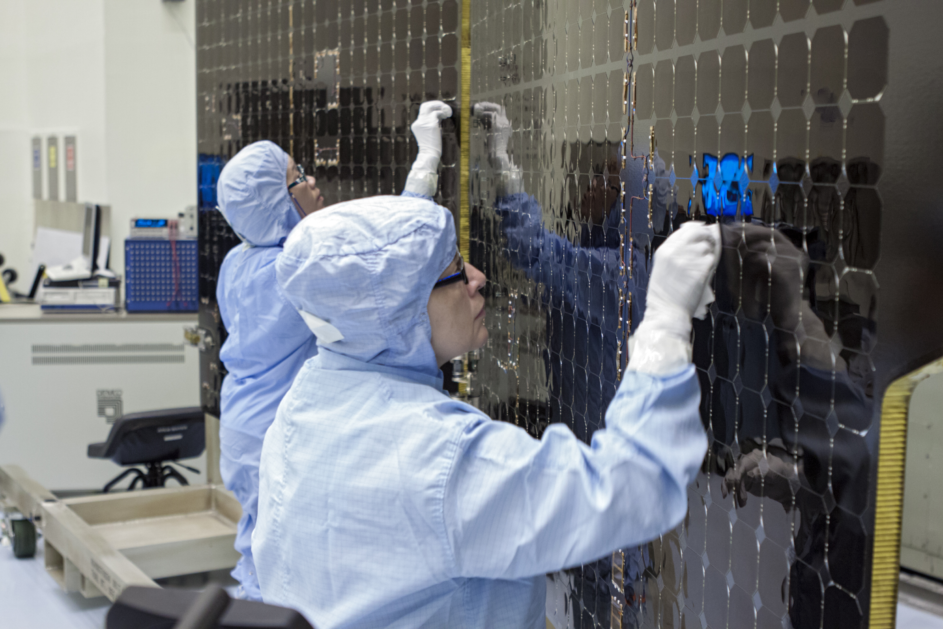 Inside Kennedy’s Payload Hazardous Servicing Facility technicians clean the electricity-producing solar arrays for the Mars Atmosphere and Volatile Evolution (MAVEN) spacecraft Aug. 28.
