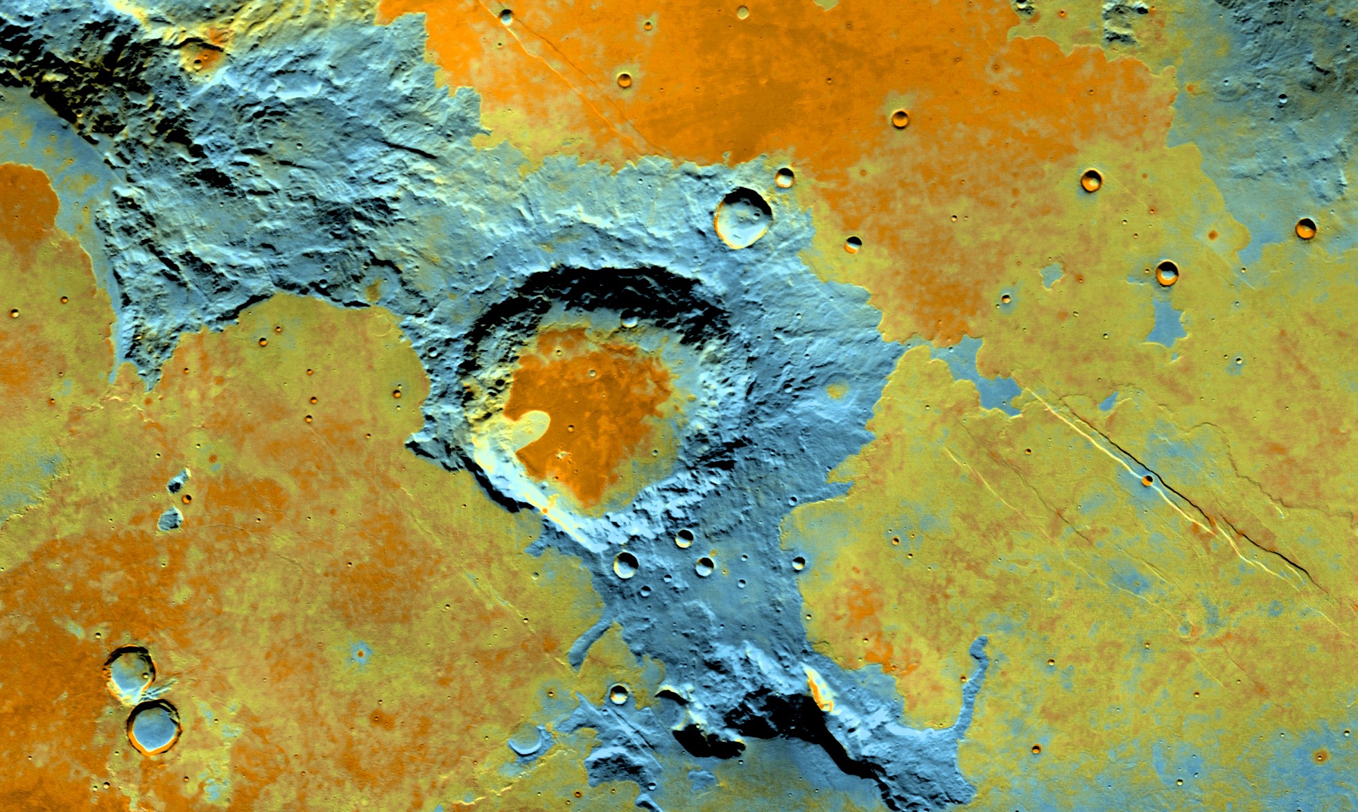 On the southwest edge of the immense volcanic region of Tharsis, lava from its giant volcanoes flowed down to meet the old cratered landscape of Terra Sirenum. Scientists cannot say how many years separate the flows from the terrain they engulfed, but the relationship between the two tells a complex tale.