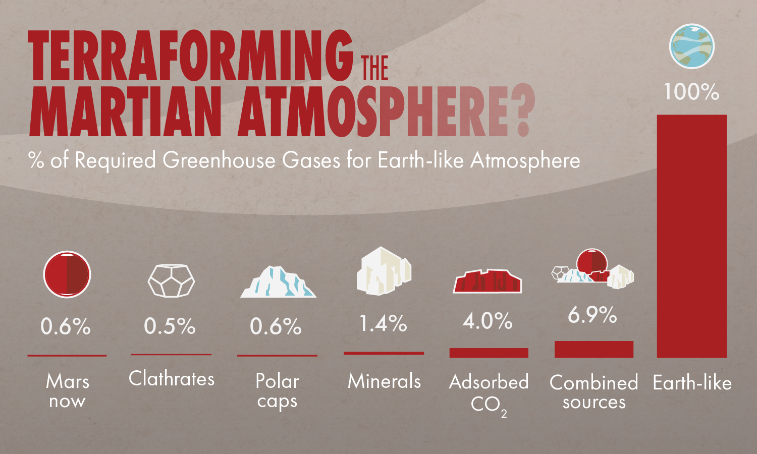 One of the challenges of terraforming Mars is to increase its atmospheric pressure, which is currently less than 1% that of Earth. The Martian polar caps, minerals, and soil could all provide sources of carbon dioxide and water to thicken the atmosphere. Unfortunately, a new study by the MAVEN science team finds that processing all sources available on Mars would only increase the pressure to about 7% that of Earth, far short of what is needed.