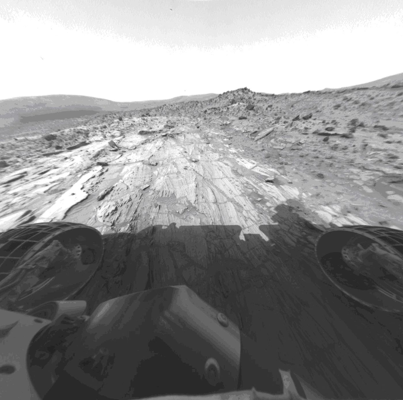 Mars scientists used images from the Mars Exploration Rovers to help them with their recent simulation 'games' for the Mars Science Laboratory rover. This image from the Spirit rover was used by the scientists to decide where to drill in one of the tests.