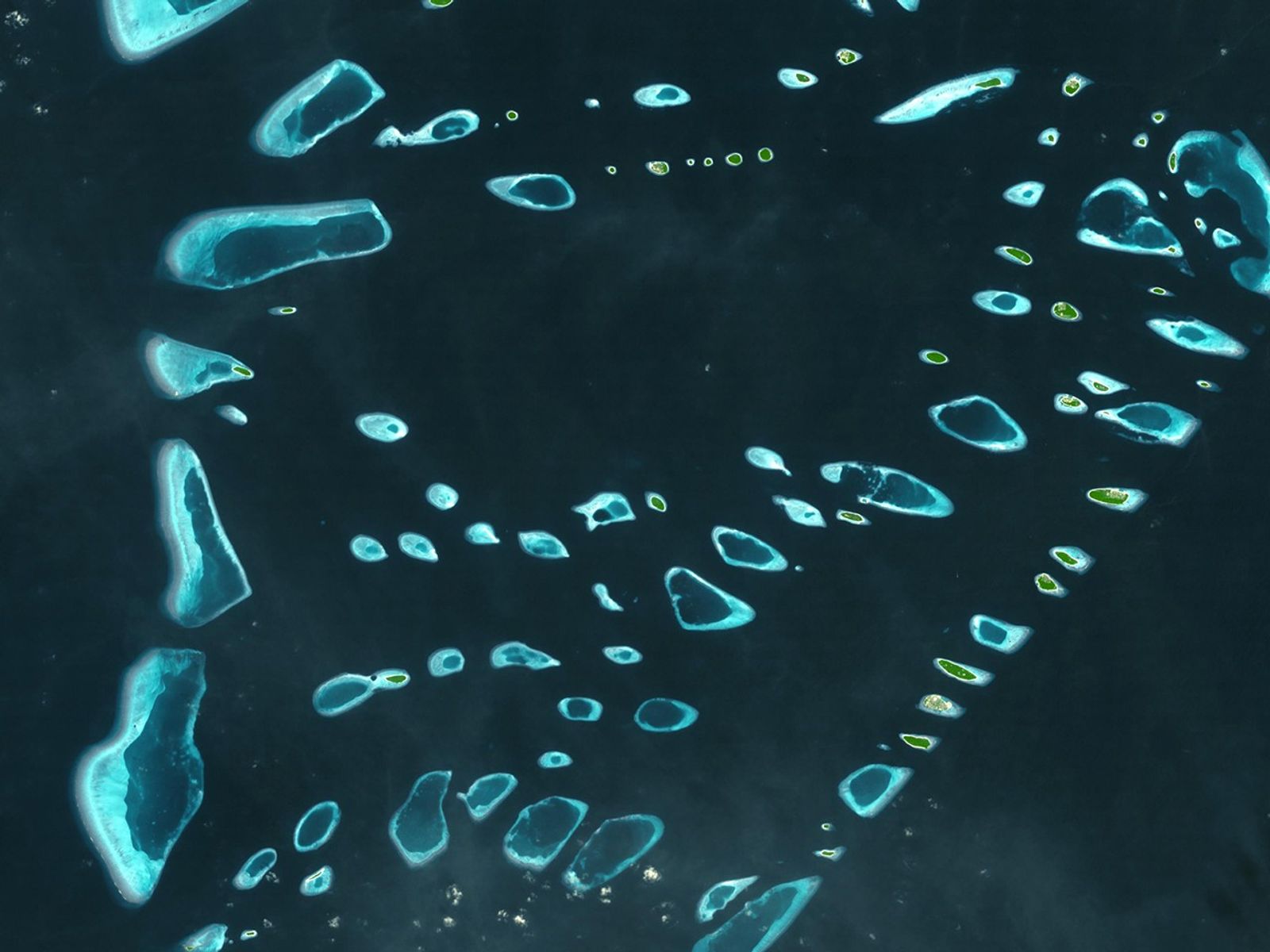 This simulated natural-color image shows the North and South Malosmadulu Atolls in the Maldives, an island republic in the northern Indian Ocean, southwest of India. The Maldives consists of a chain of almost 1200 small coral islands that are grouped into clusters of atolls. It is home to about a third of a million people. Arguably the lowest-lying country in the world, the average elevation is 1 meter (3.3 feet) above sea level. Waves triggered by the great tsunami of December 2004 spilled over sea walls to flood the capital with sandy water and then swept out just as suddenly. Residents fear this was a foreboding of disasters to come from sea level rise due to global warming. The image was taken on 22 December 2002, and covers an area of 51 x 90 kilometers (32 x 56 miles).