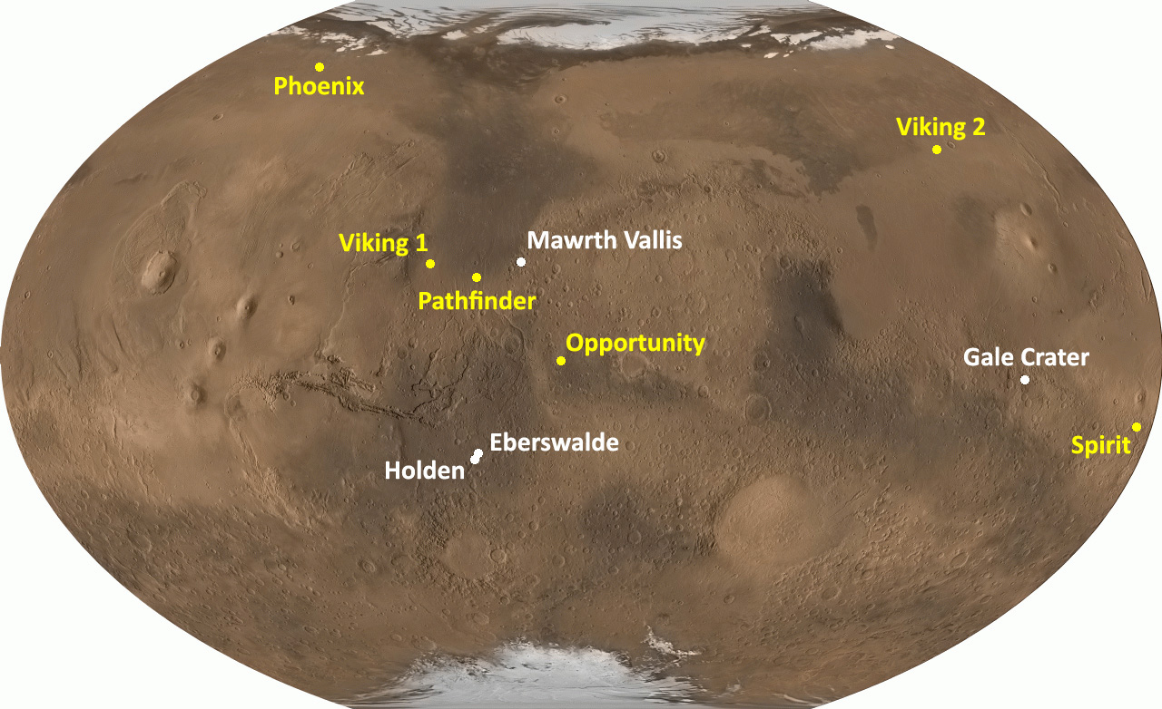 This map of Mars shows 4 possible landing sites for the Mars Science Laboratory. Aslo shown are the landing sites for past missions; Phoenix, Viking 1, Viking 2 Pathfinder, Opportunity and Spirit.