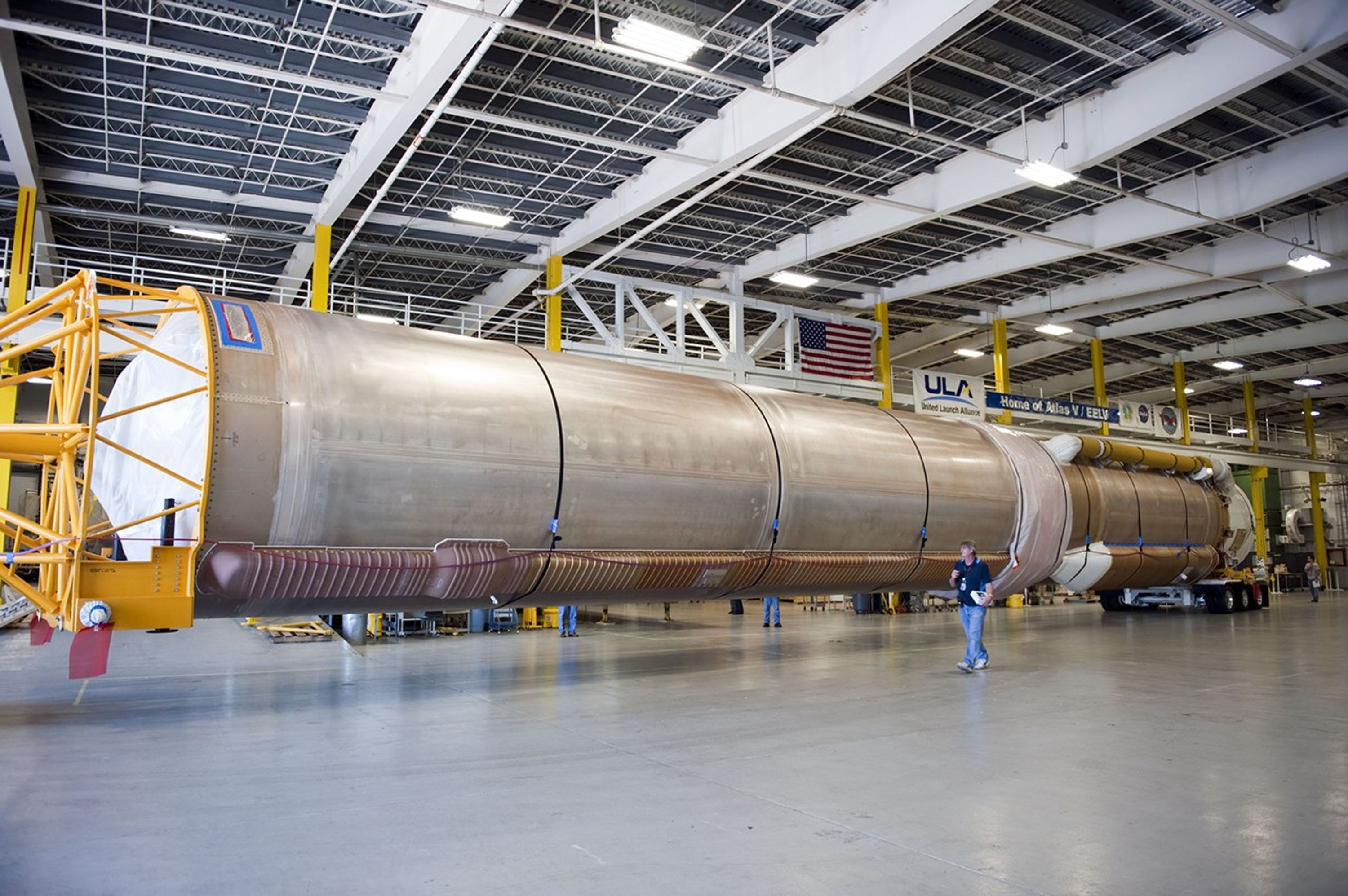 The Atlas V first stage to support the Mars Science Laboratory (MSL) mission is positioned inside the Atlas Spaceflight Operations Center on Cape Canaveral Air Force Station in Florida.
