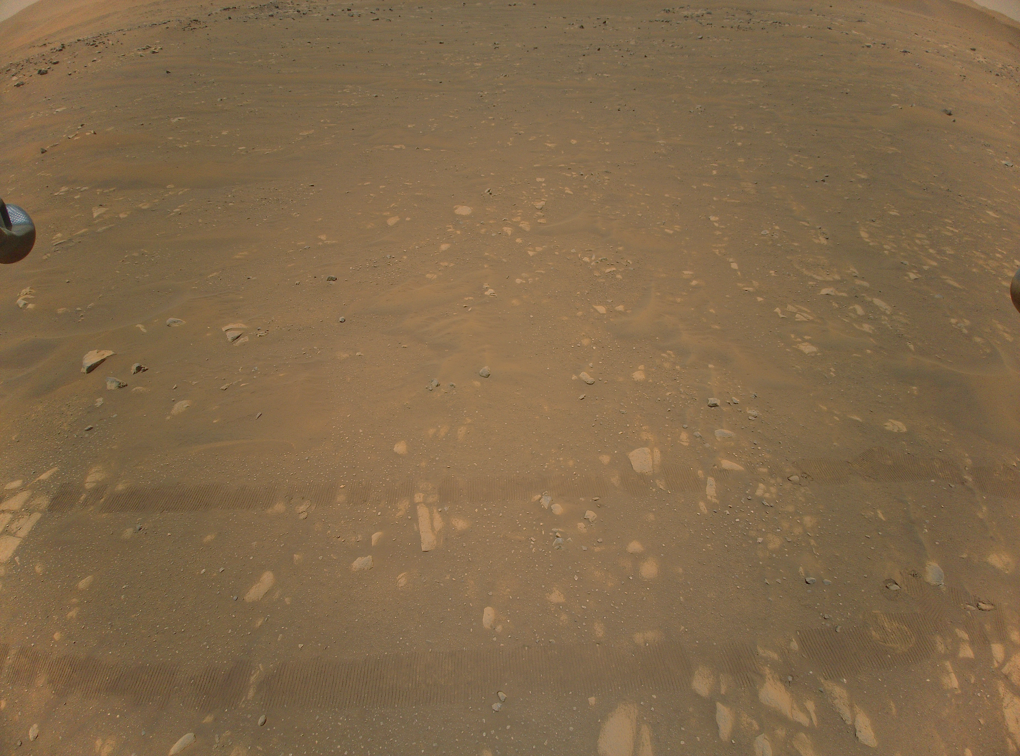 This is the third color image taken by NASA’s Ingenuity helicopter. It was snapped on the helicopter’s second flight, on April 22, 2021, from an altitude of about 17 feet (5.2 meters). Tracks made by NASA’s Perseverance Mars rover can be seen as well.