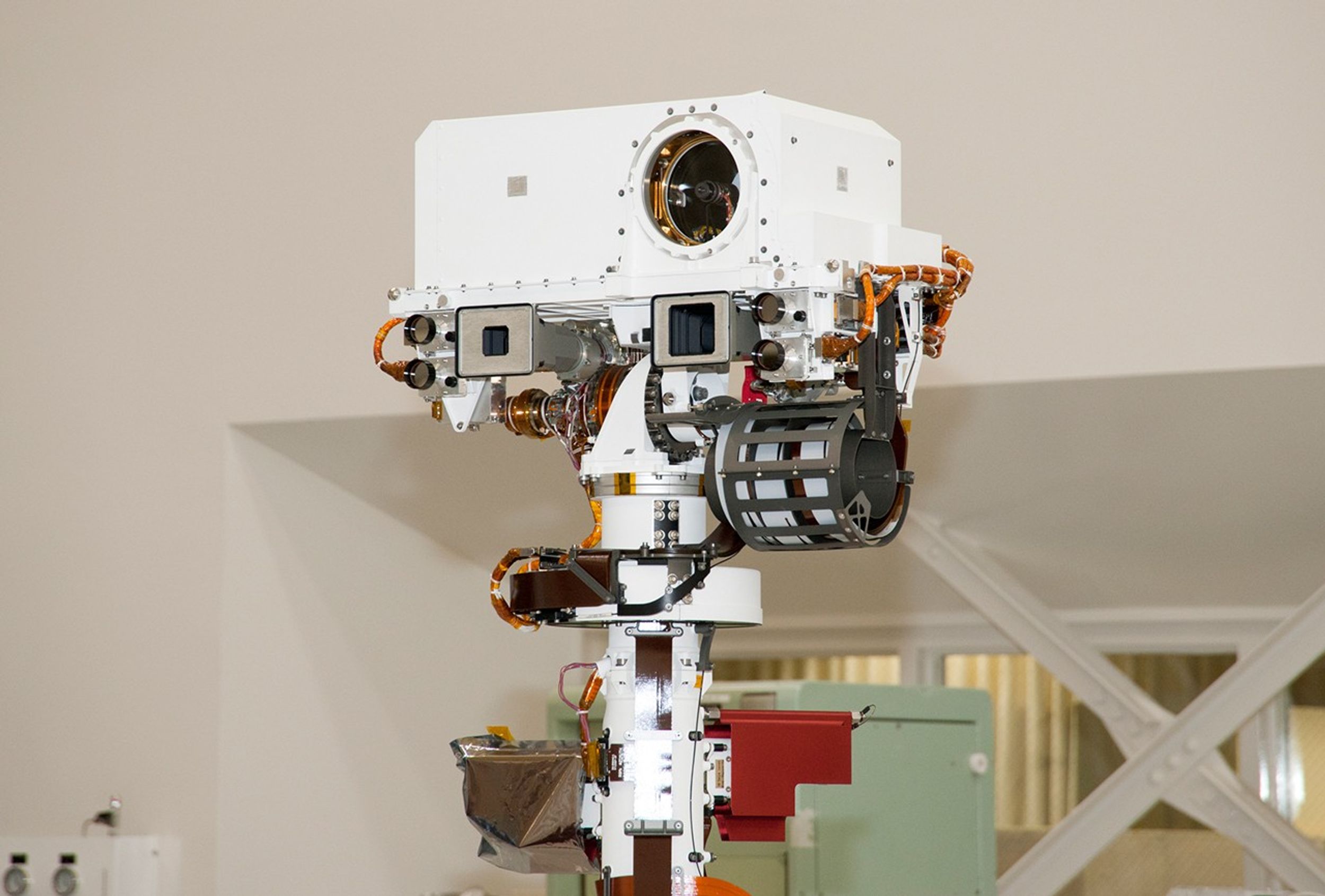 The remote sensing mast on NASA Mars rover Curiosity holds two science instruments for studying the rover's surroundings and two stereo navigation cameras for use in driving the rover and planning rover activities. This view of the top of the mast was taken April 4, 2011, inside the Spacecraft Assembly Facility at NASA's Jet Propulsion Laboratory, Pasadena, Calif. For scale, the width of the white box at the top is about 0.4 meter (16 inches).
