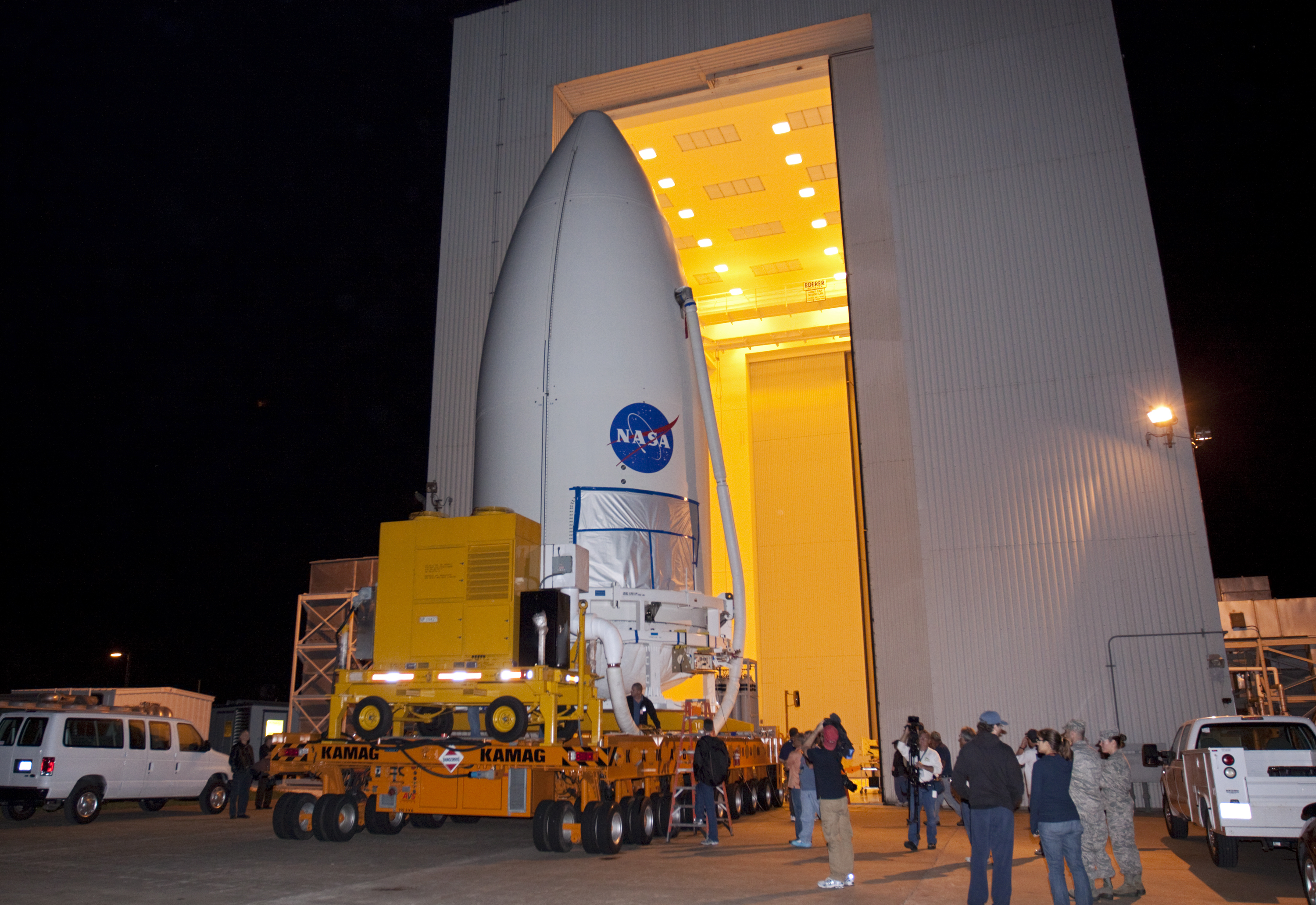 CAPE CANAVERAL, Fla. -- Standing atop a payload transporter, the Atlas V rocket payload fairing containing NASA's Mars Science Laboratory (MSL) spacecraft rolls out of the Payload Hazardous Servicing Facility at Kennedy Space Center in Florida, beginning the move to Space Launch Complex 41. The fairing will protect the payload from heat and aerodynamic pressure generated during launch. MSL's components include a compact car-sized rover, Curiosity, which has 10 science instruments designed to search for evidence on whether Mars has had environments favorable to microbial life, including the chemical ingredients for life. The unique rover will use a laser to look inside rocks and release its gasses so that the rover's spectrometer can analyze and send the data back to Earth. Launch of MSL aboard a United Launch Alliance Atlas V rocket is planned for Nov. 25 from Space Launch Complex 41 on Cape Canaveral Air Force Station.
