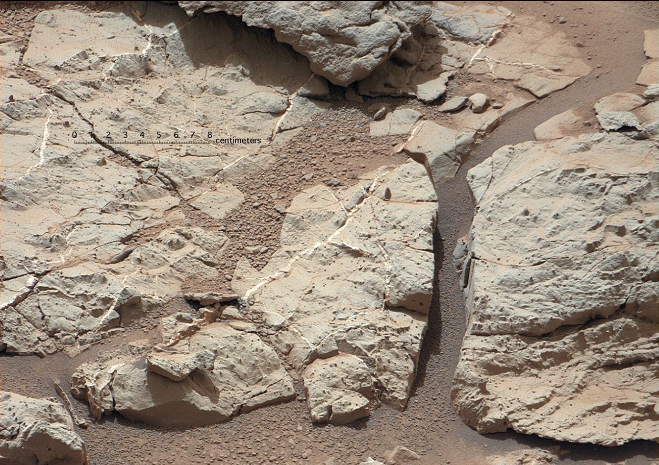 This image of an outcrop at the "Sheepbed" locality, taken by NASA's Curiosity Mars rover with its right Mast Camera (Mastcam), shows well-defined veins filled with whitish minerals, interpreted as calcium sulfate.