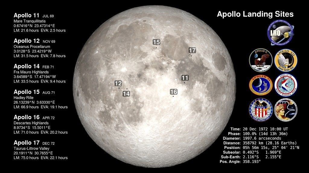 The six Apollo landing sites are revealed chronologically as the phase and libration of the Moon is shown throughout the Apollo era. Annotations describe the landing sites and the durations on the lunar surface.