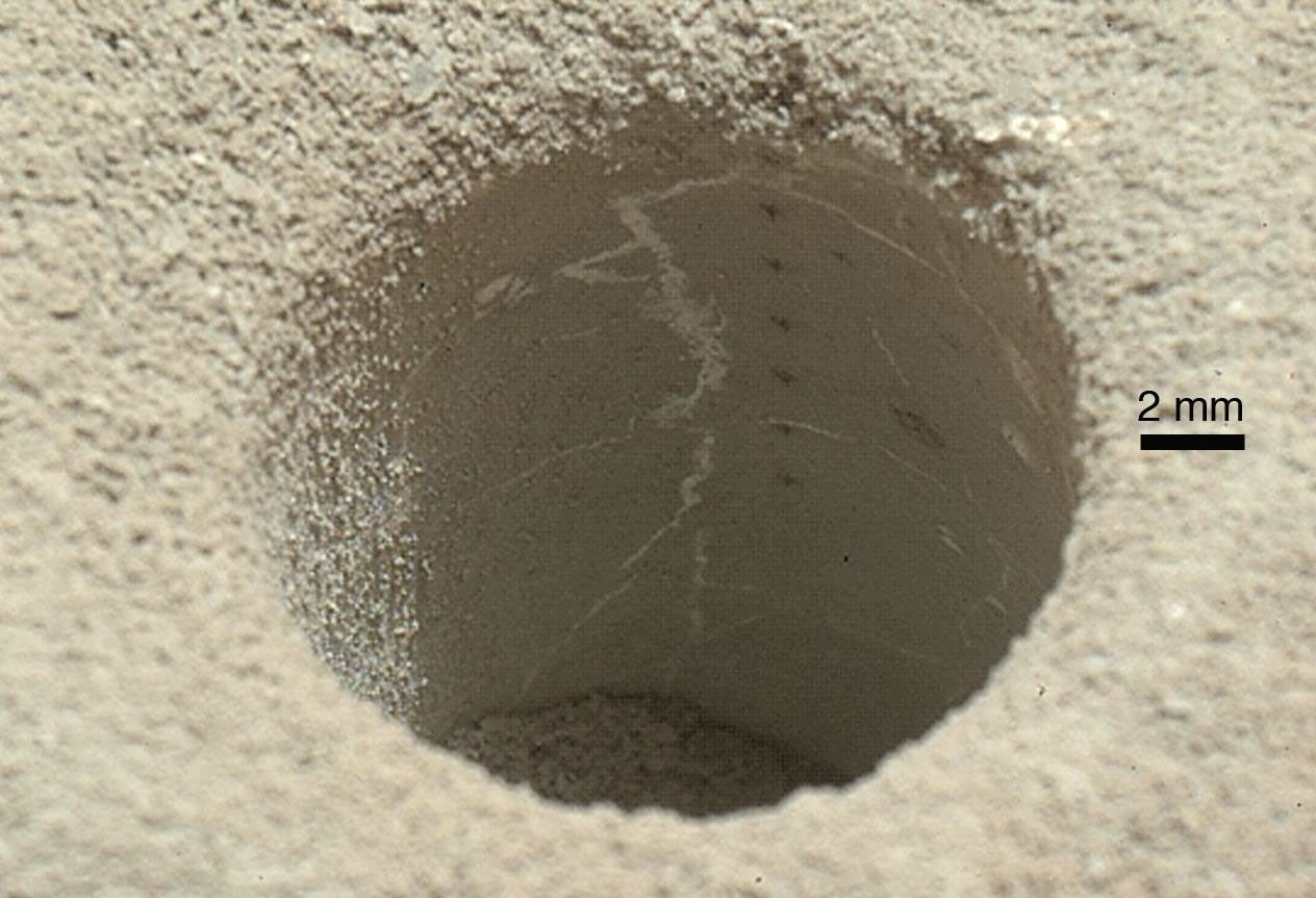 The hole that NASA's Curiosity Mars rover drilled into target rock "John Klein" provided a view into the interior of the rock, as well as obtaining a sample of powdered material from the rock.