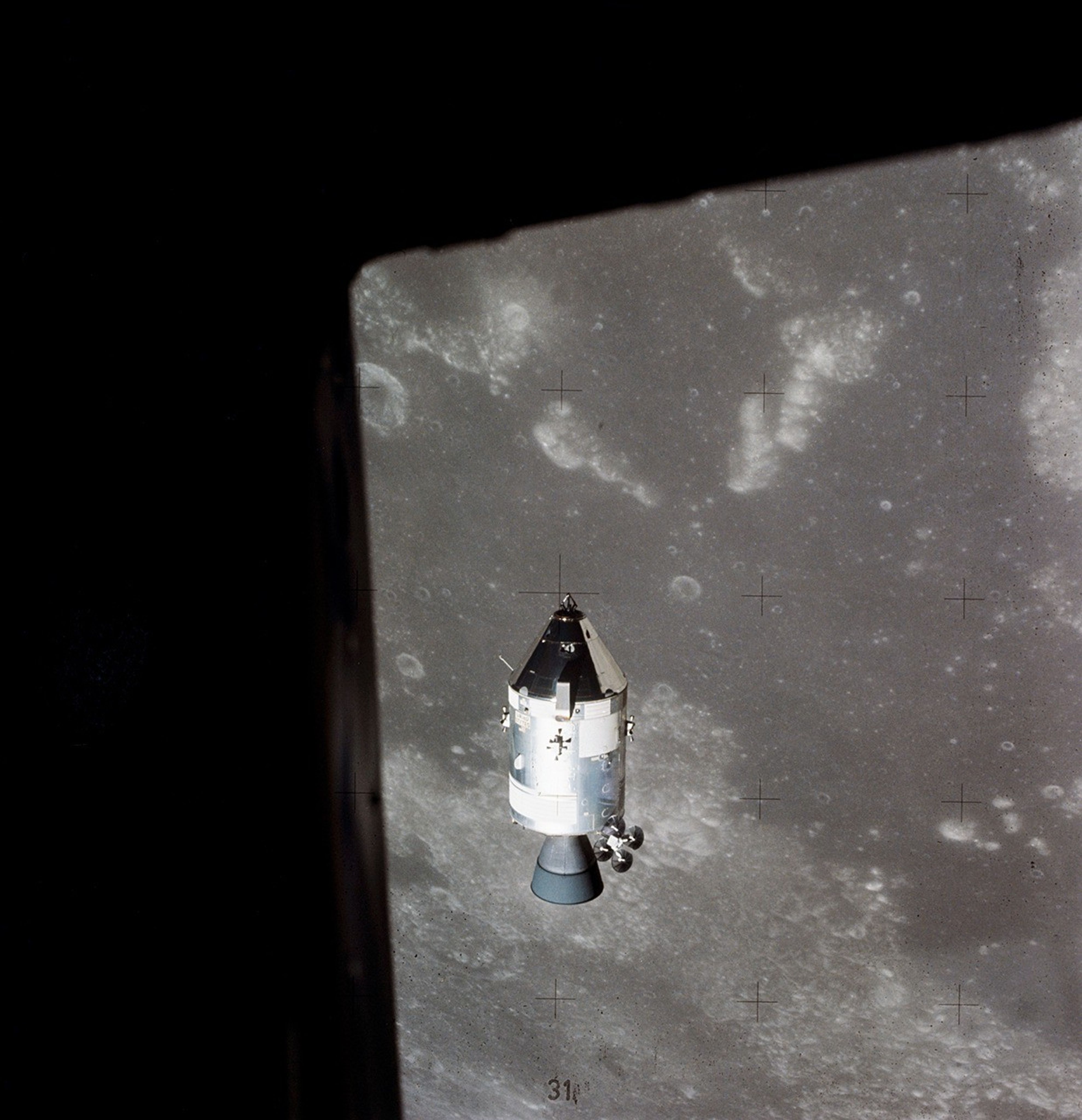 A view of the Apollo 15 Command and Service Modules (CSM) in lunar orbit as photographed from the Lunar Module (LM) just after rendezvous. The lunar nearside is in the background. This view is looking southeast into the Sea of Fertility. The crater Taruntius is at the right center edge of the picture.