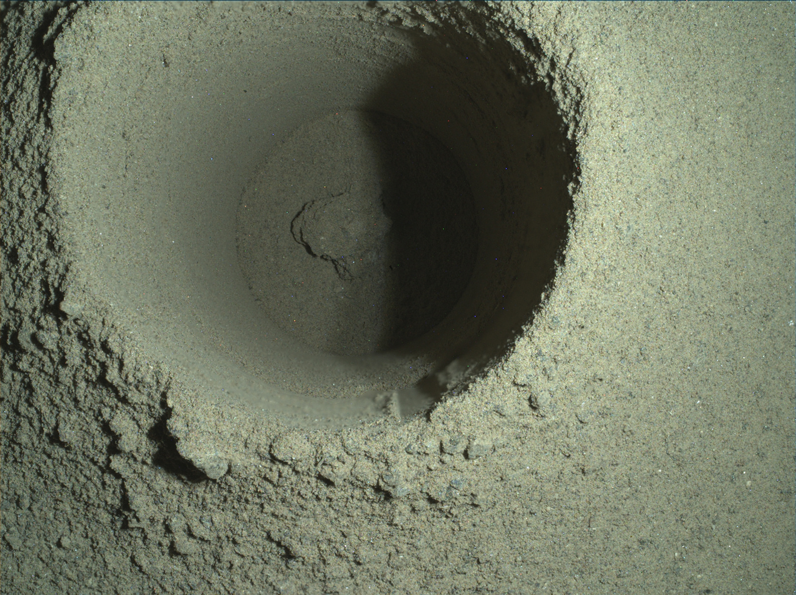 This composite image of the first borehole drilled by NASA’s Perseverance rover on Mars was generated using multiple images taken by the rover’s WATSON (Wide Angle Topographic Sensor for Operations and eNgineering) imager. The borehole is 1.06 inches (2.7 centimeters) in diameter.
