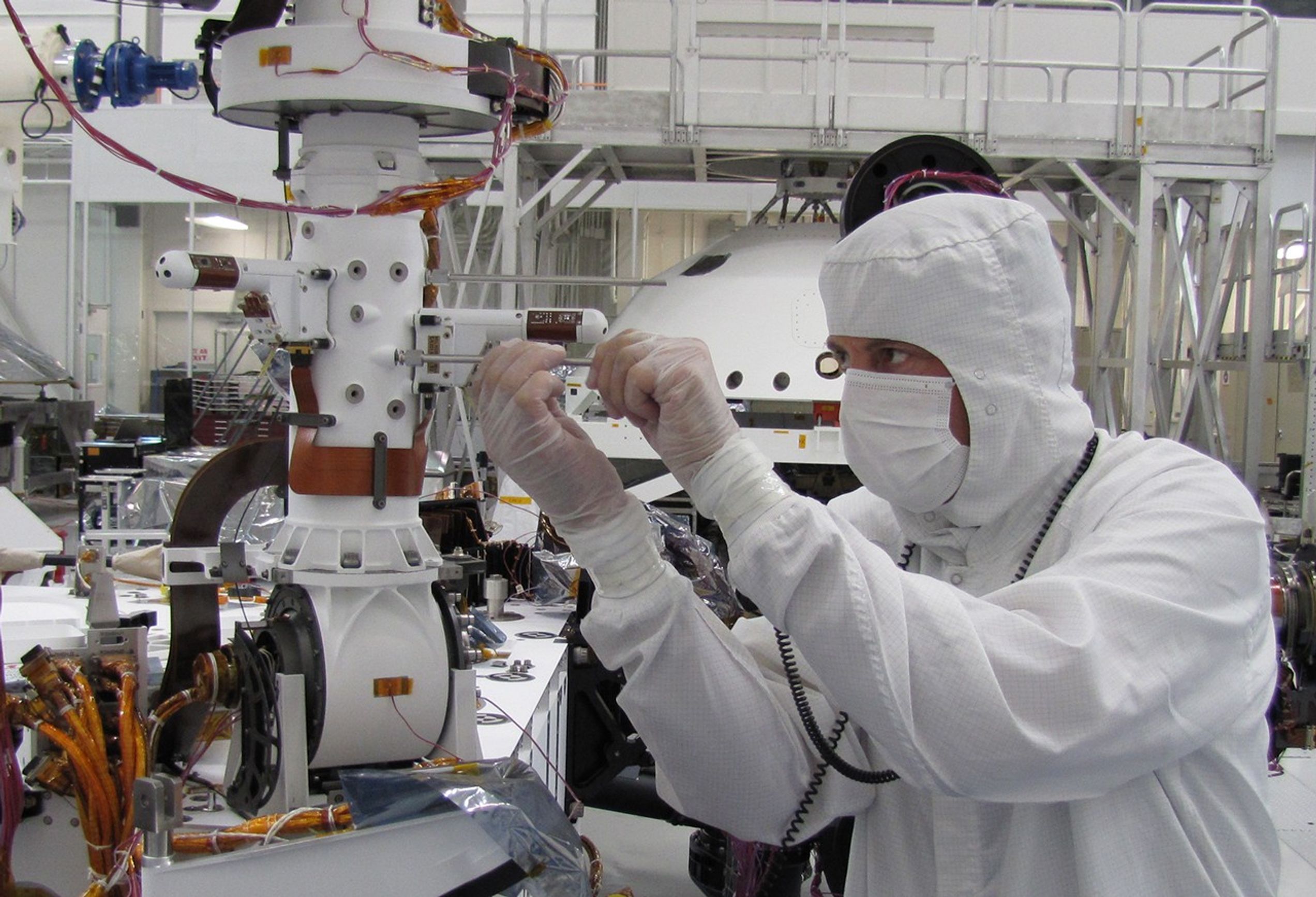 In this image, the spacecraft specialist's hands are just below one of the REMS mini-booms. The other mini-boom extends to the left a little farther up the mast. The image was taken during installation of the instrument in September 2011, inside a clean room at NASA's Jet Propulsion Laboratory, Pasadena, Calif. REMS also includes an ultraviolet-light sensor on the rover deck and, inside the body of the rover, an air-pressure sensor and the instrument's data recorder and electronic controls.