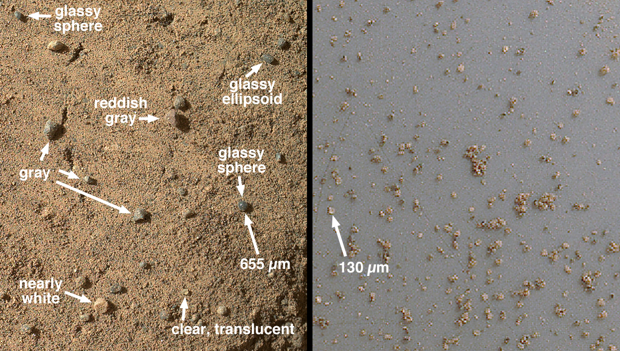 The picture on the left, acquired on the 58th Martian day or sol of the mission (Oct. 4, 2012), covers an area of about 0.75 by 0.87 inches (1.9 by 2.2 centimeters) and shows some of the variety of coarse sand grains observed on a portion of the Rocknest wind drift that was flattened by the left front rover wheel. Though Mars is thought of as the Red Planet, the sands of Mars are not necessarily red. This one small area shows clear, translucent grains, gray sand and white sand, in addition to two blue-gray glassy spheres and a glassy ellipsoid. The spherical and ellipsoidal grains were likely formed from molten droplets that cooled above the Martian surface to form glass, either during an explosive volcanic eruption or an impact cratering event. Similar grains are found in association with impacts on Earth and explosive volcanoes on the moon. The larger glassy sphere is 0.026 inches (655 micrometers) in diameter.