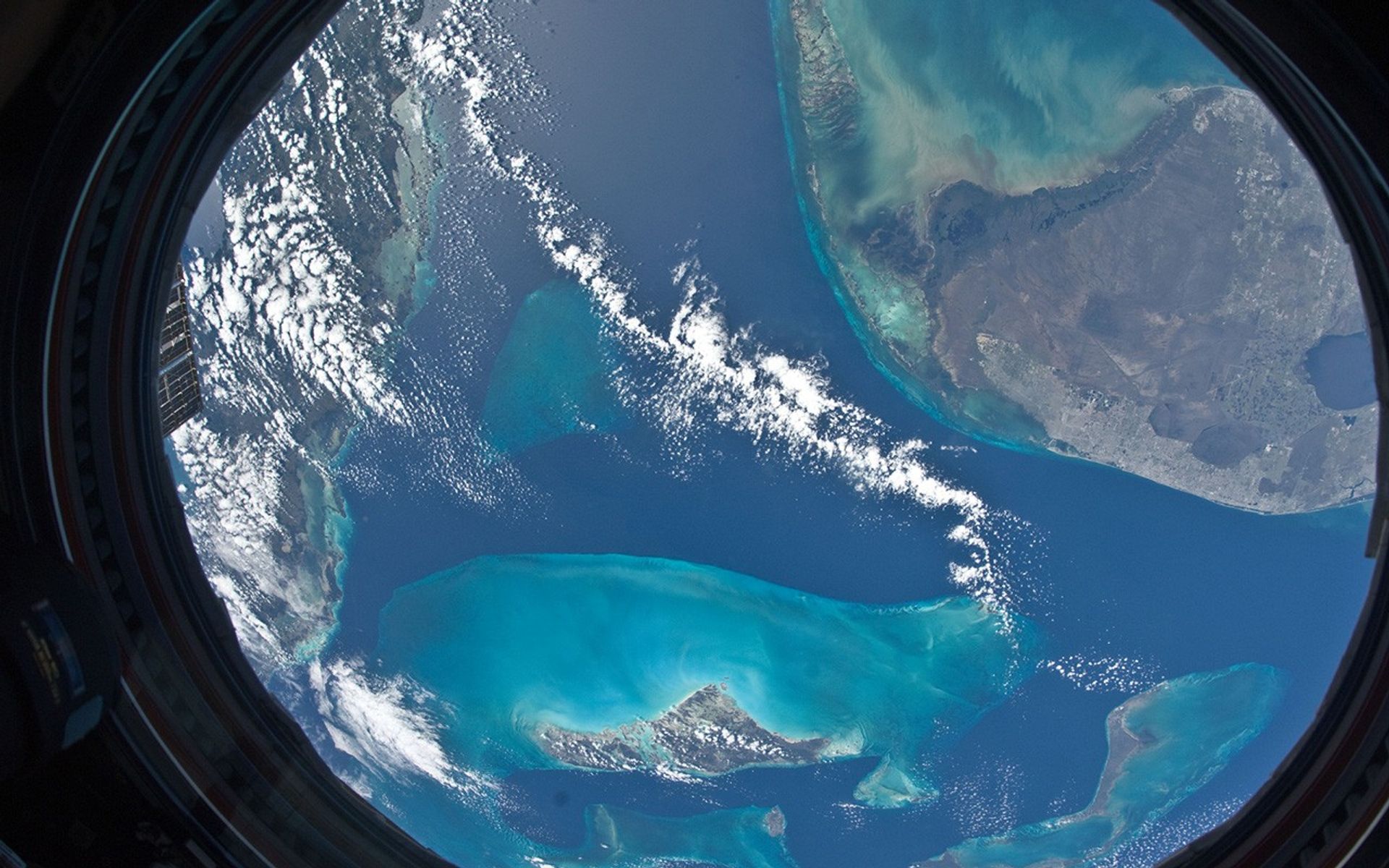 Parts of the Atlantic, Gulf of Mexico and Caribbean Sea as seen from the International Space Station 220 miles above Earth, from the Cupola window. The image was taken on November 9, 2010 by one of the Expedition-25 crew members using a 16-millimeter f/2.8D lens, which gives the image a fish-eye effect.