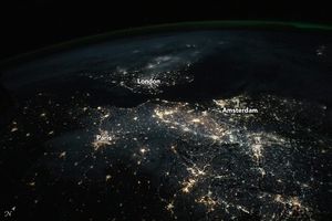 Major cities in northwestern Europe shine bright in this nighttime photo, taken by an astronaut aboard the International Space Station.