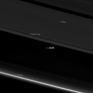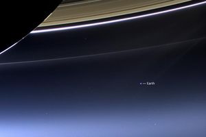 Seen from a billion kilometers away, through the ice and dust particles of Saturnâs rings, Earth appears as a tiny,…
