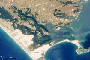 Pale fields of sand dunes are interspersed with deep green, mangrove-lined streams on the southern Baja Peninsula.