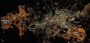The older and newer cities of the Greater Cairo region look very different at night when viewed from above.