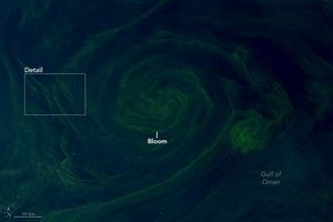 In the Gulf of Oman, eddies drew seasonal phytoplankton blooms into mesmerizing whirls.Â