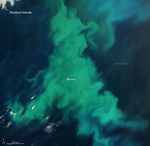 Phytoplankton imparted brilliant blues and greens to North Sea waters near the Scottish archipelago in June 2025.