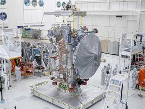 Engineers and technicians install a 10-foot (3-meter) high-gain antenna on NASA’s Europa Clipper spacecraft on Aug. 14, 2023. The orbiter…