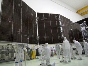 Technicians stow for launch a solar array on NASA’s Juno spacecraft. Each of Juno’s three solar arrays is 9 feet…