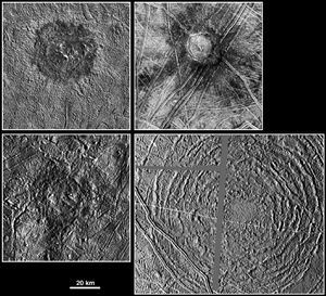 The picture compares four large impact structures on Jupiter’s icy moon, Europa. Clockwise, from top left, are Pwyll, Cilix, Tyre,…