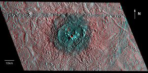 This shaded relief highlights relative elevations around Cilix crater on Jupiter’s moon, Europa. North is to the top of the…