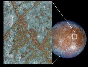The image on the left shows a region of Europa’s crust made up of blocks which are thought to have…