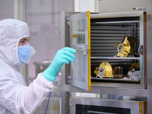Europa Clipper’s thermal imager (called E-THEMIS) sits in its protective enclosure in the cleanroom at Arizona State University, as technicians…