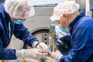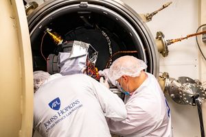 In this photo, the Plasma Instrument Calibration Chamber at the Johns Hopkins Applied Physics Laboratory (APL) in Laurel, Maryland, recreates…