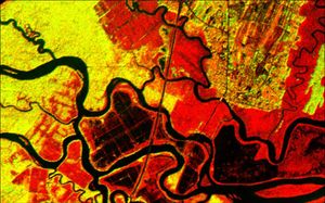 This radar image acquired by NASA's Airborne Synthetic Aperture Radar in 2001, shows the Altamaha River Delta in the Georgia…