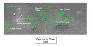On this map of Mars, spectrometers on spacecraft orbiting Mars have detected clay minerals (green) and hydrated minerals-- clays, sulfates…