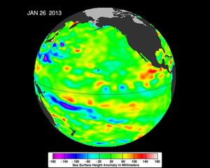 The latest image of sea surface heights in the Pacific Ocean from NASA's Jason-2 satellite shows that the equatorial Pacific…
