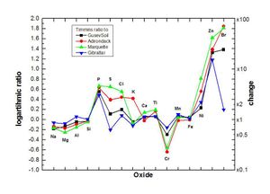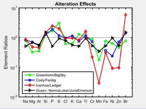 This graph shows the ratio of concentrations of several elements in four different pairs of targets examined by Alpha Particle…