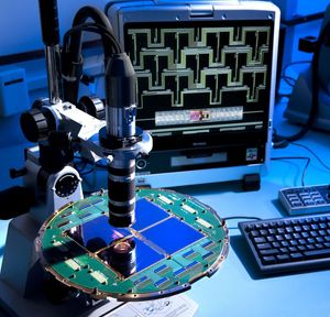 This image shows one of the NASA detectors from the BICEP2 project, developed in collaboration with the NSF. The sensors…