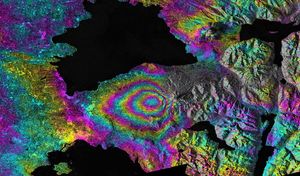 This satellite interferometric synthetic aperture radar image-pair shows relative deformation of the Earth's surface when nn April 22-23, 2015, significant…