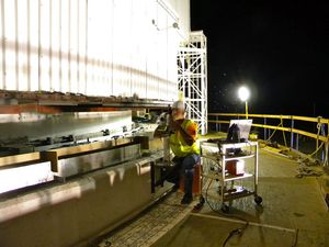 As the sun sets on July 8, 2010, workers prepare to pour new epoxy grout for the hydrostatic bearing assembly…