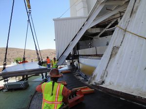 Workers in Goldstone, Calif., guide a new runner segment into the hydrostatic bearing assembly of a giant, 70-meter-wide (230-foot-wide) antenna…