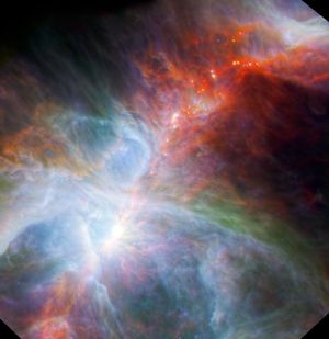 NASA's Spitzer Space Telescope and ESA's Herschel mission combined to show this view of the Orion nebula, found below the…