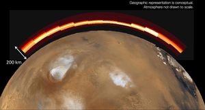 This graphic depicts what Mars' atmosphere would have looked like to a viewer with ultraviolet-seeing eyes after a meteor shower…