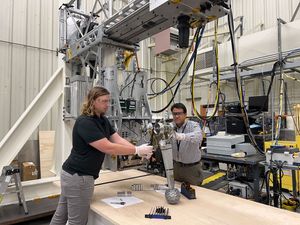 Engineers at NASA's Jet Propulsion Laboratory prepare flight-like landing gear in the Europa Lander landing gear testbed in summer 2022.