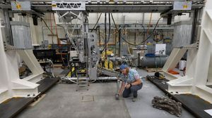 Engineers at NASA's Jet Propulsion Laboratory prepare flight-like landing gear in the Europa Lander landing gear testbed in summer 2022.