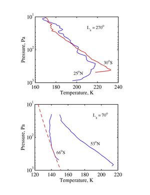 NASA's Mars Global Surveyor shows vertical temperature and pressure structure observed in the northern and southern hemispheres of Mars.