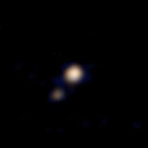 This image of Pluto and its largest moon, Charon, was taken by the Ralph color imager aboard NASA's New Horizons…