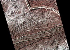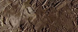 This enhanced color image shows cracks and ridges on Europa's surface that reveal a detailed geologic history. The view was…