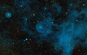 Wispy tendrils of hot dust and gas glow brightly in this ultraviolet image of the Cygnus Loop nebula, taken by…