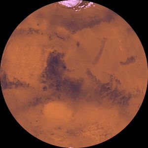 The top half of Mars is dominated by the Tharsis Montes volcanoes, the large Alba Patera shield volcano, the dark…