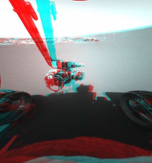 This is a three-dimensional stereo anaglyph of an image taken by the front hazard-identification camera onboard NASA's Mars Exploration Rover…